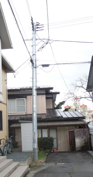 行き止まりの路地で発見した木製電力柱。