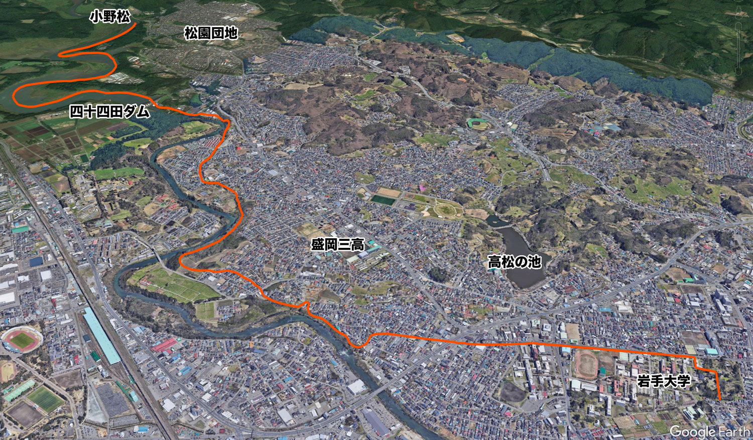 北上川上水堰 経路 クリックで拡大 出典:グーグル 消えた 北上川上水堰