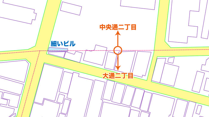 地図で確認すると、先程の突き当りからこのビルを結んだ線が、中央通二丁目と大通二丁目の町字境界になっています。水路があった当時の名残でしょう。