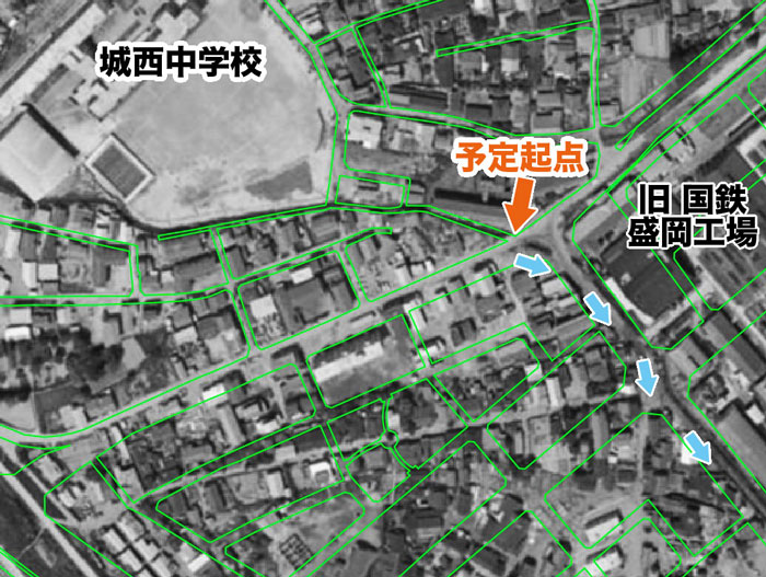 2024年11月5日、下流の盛岡駅西通から水路跡と思われる経路を辿り、城西町〜天昌寺町〜大新町まで歩きました。航空写真では気が付かなかった「本流」を現場で見つけたりしましたが、迷路に迷い込み、時間切れで撤収しました。
