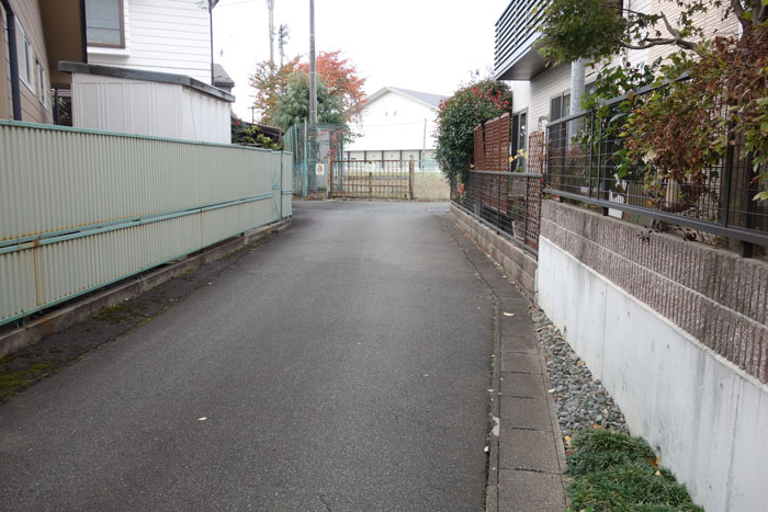 新しくできた4階建てのアパート横。この辺りは古い道や水路敷地が錯綜していて、いろいろと謎なところです。