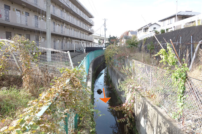 このフェンスに挟まれた部分が、水路敷地だと思います。ただし現況で使われている様子はなく、水路「跡」でしょう。木がここまで育ってしまうことから、あまり管理されていない様子が伺えます。
