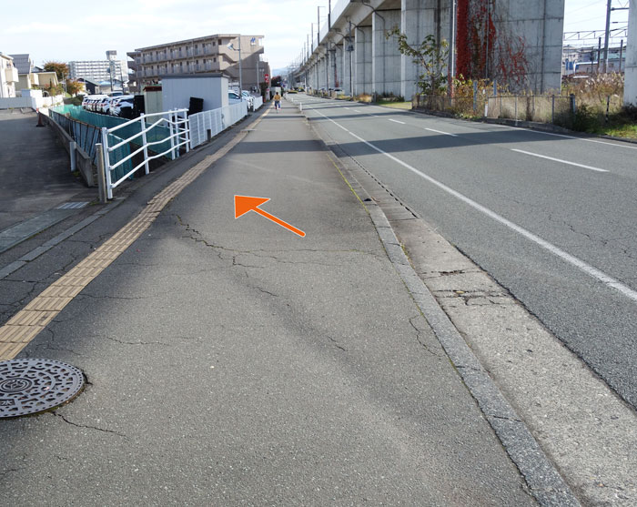 開渠が暗渠に変わって伸びていることが、歩道のアスファルト舗装の不陸から分かります。