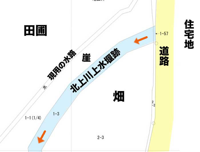 後で公図と登記を調べてみました。地番1-3の元地目が「用悪水路」になっています。ここも北上川上水堰の跡でしょう。
