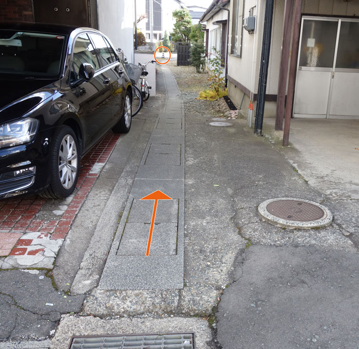 後ろ側の区画まで見えていて(奥にコーンが見える)通れそうな気もするのですが、ちょっと遠慮して裏側に回り込みます。