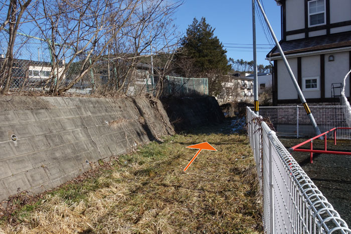 振り返って反対側(上流の西側へ続く方向)。こちらには人の歩いた轍があって、行ってもいいのかな?思いつつ、どうみてもモリオカロイヤルテニスクラブの敷地に入ってしまう気がします。
