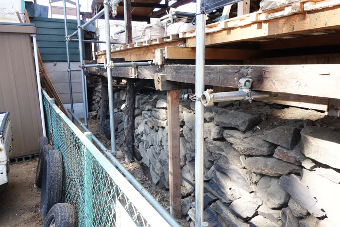 連正寺の解体時に現れた、遠曲輪の土塁跡ではないかと思われる石積。