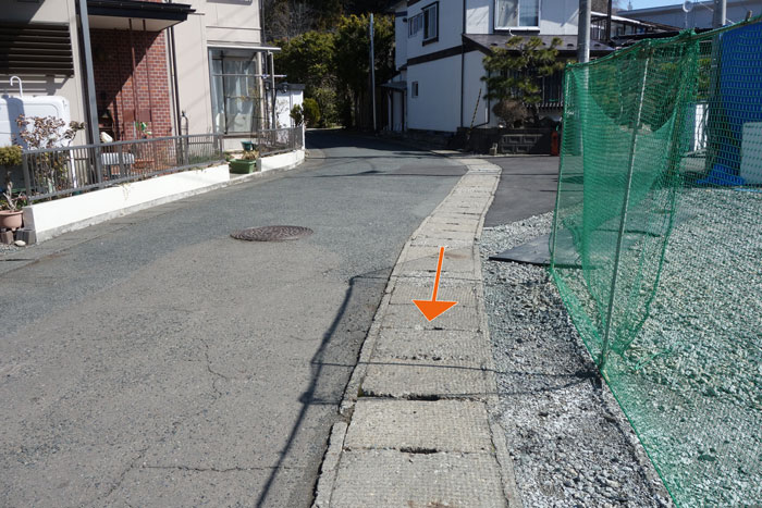 なんとも言えない曲線を伴って、コンクリート側溝が続いています。