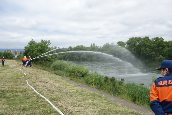 北上川の仙北町川岸で、消防ポンプ機関運用訓練が行われました。