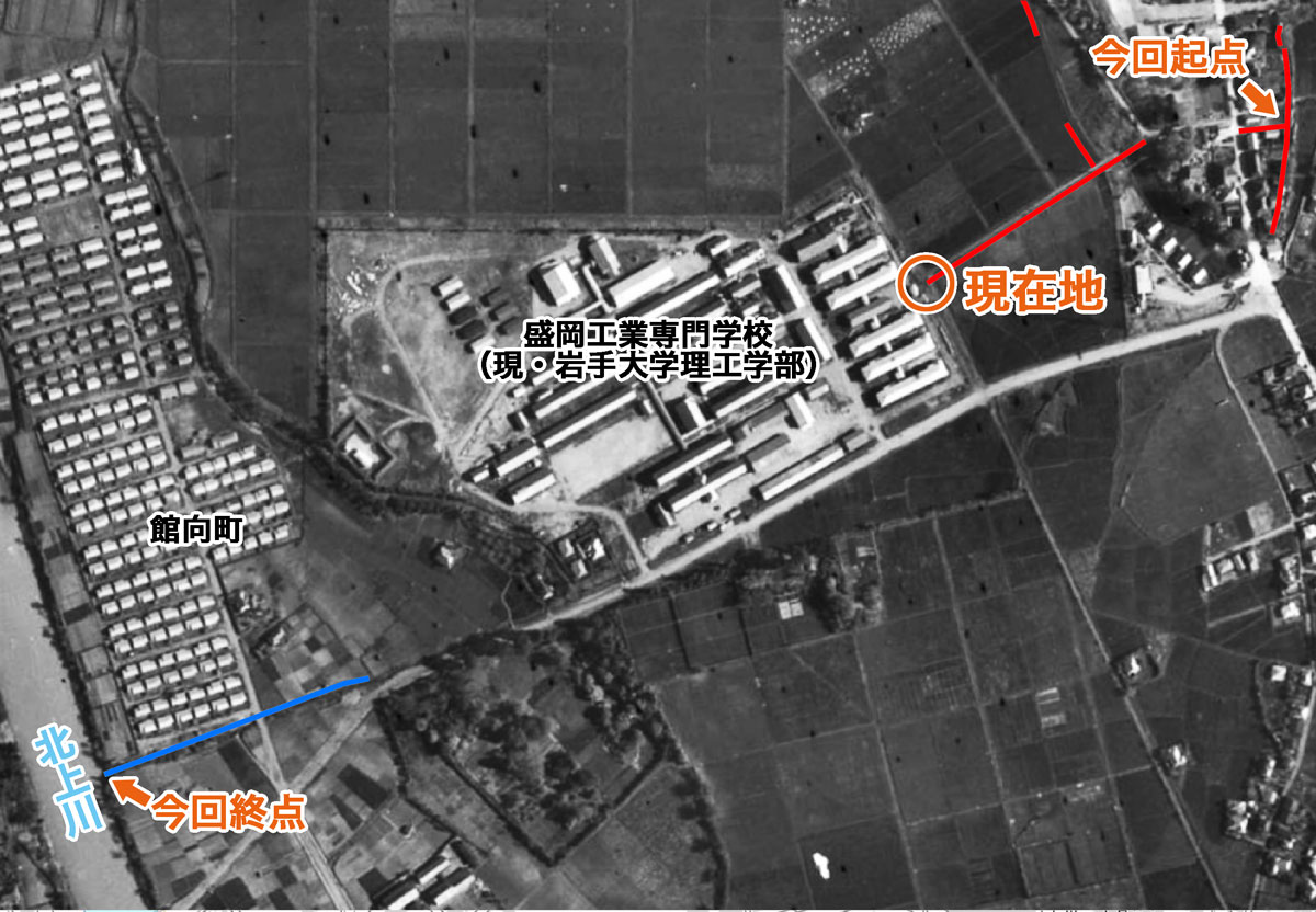 昭和23年(1948)の航空写真です。この時点ですでに、岩手大学理工学部の前身となる、盛岡工業専門学校が経路を分断しています。