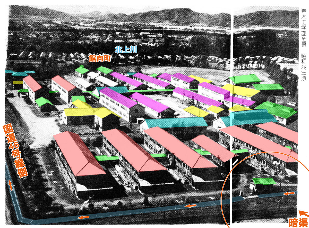 県立図書館で見つけた、岩手大学理工学部の古い写真を見ると、水路は敷地周辺の道路沿いに移設されたのではないかと思われます。