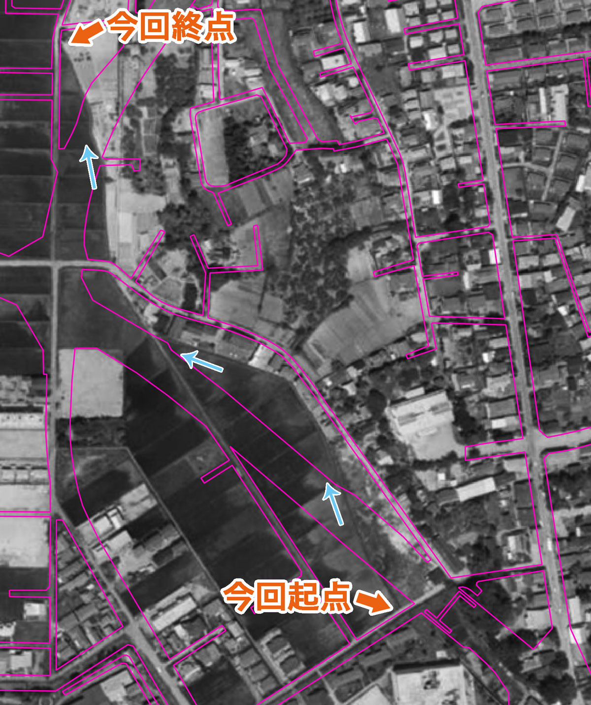 昭和40年(1965)の航空写真。水路の左側(西側)には田圃が広がっています。