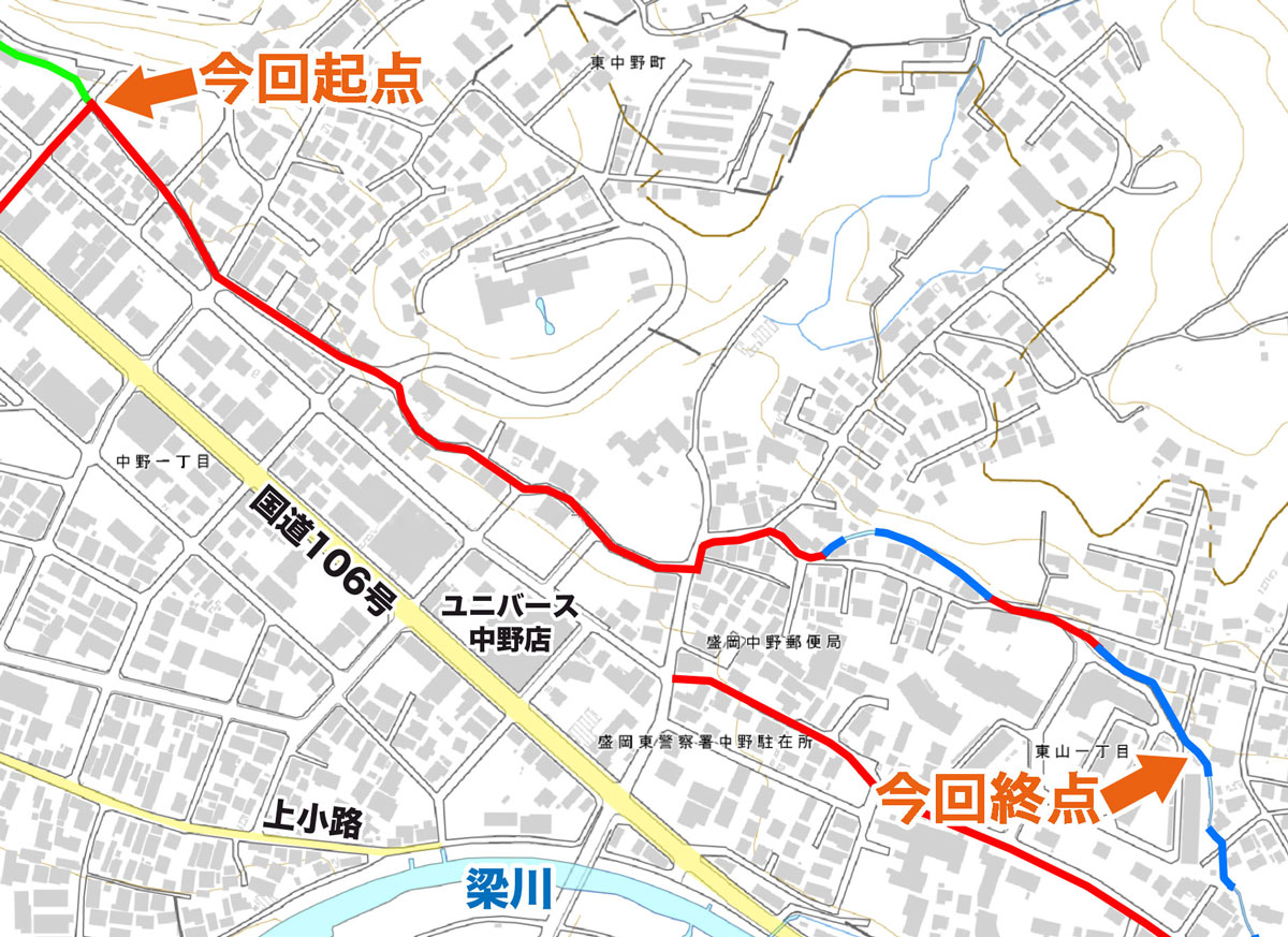 コンクリート暗渠が道路のアスファルト下に続きます。