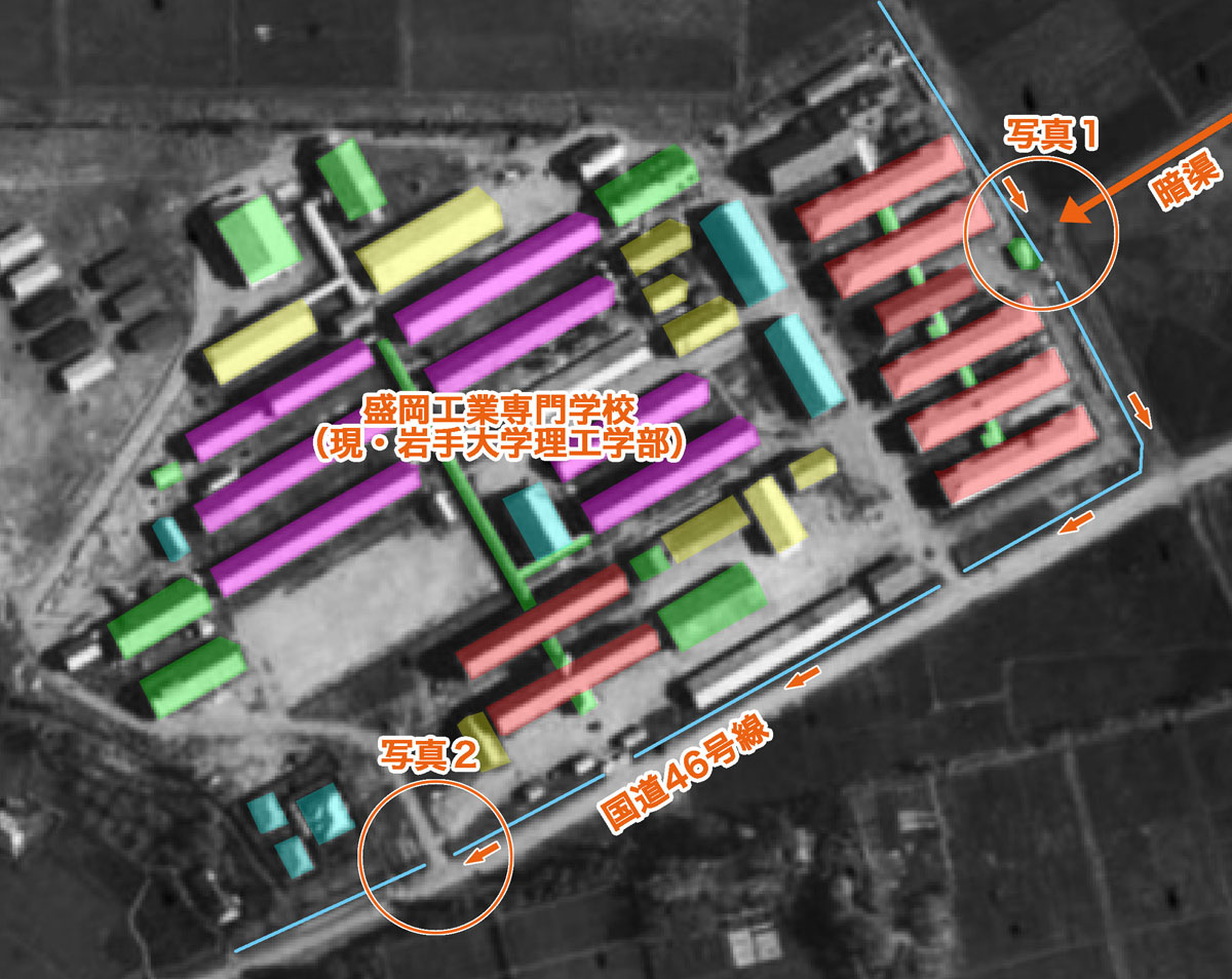 航空写真は盛岡工業専門学校、写真1は岩手大学工学部、写真2は盛岡高等工業学校の時となります。
