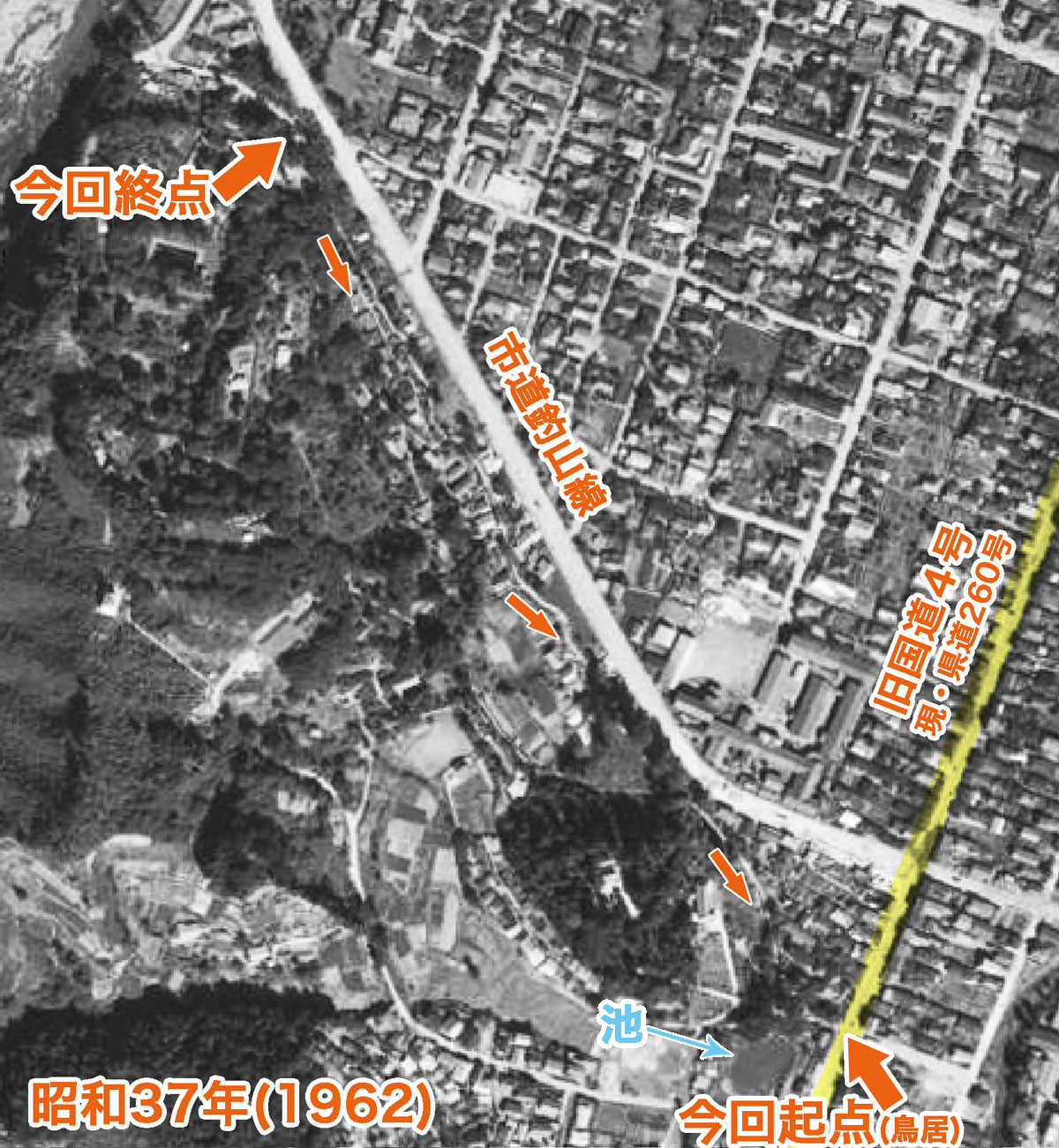 昭和37年(1962)の航空写真。今回の経路は道になっているように見えます。民家も建ち並び、下の道路(市道釣山線)も通っており、現況に近い形になっています。